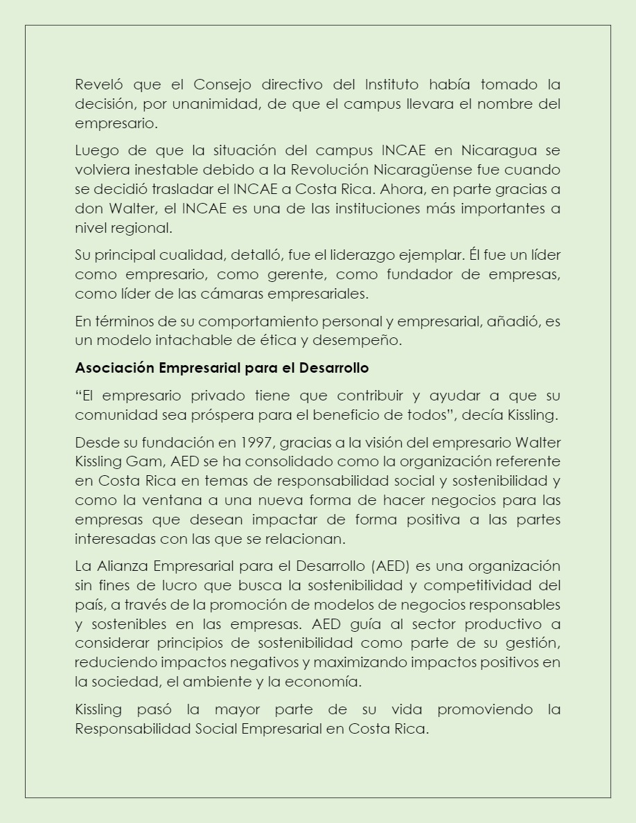 Escuela Superior de Negocios INCAE y El Financiero nombran a Walter Kissling como triunfador de vida y modelo a seguir